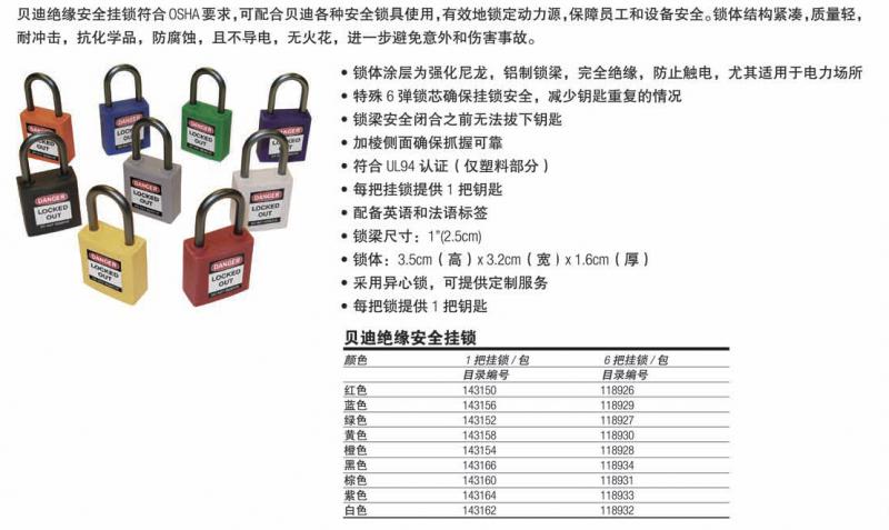 掛鎖是OSHA規(guī)定的上鎖掛牌過(guò)程中不可缺少的產(chǎn)品,配合安全鎖具和吊牌完成整個(gè)上鎖掛牌活動(dòng)。掛鎖的作用在于確保在維修維護(hù)活動(dòng)中,工人不會(huì)在無(wú)意間打開(kāi)一臺(tái)其他人正在使用的設(shè)備。而貝迪可為您提供多種選擇,高品質(zhì)的安全掛鎖,銅鎖,鋼鎖以及鋁鎖可滿(mǎn)足不同應(yīng)用場(chǎng)所的需要。